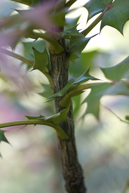 葉は奇数羽状複葉で、互生し、小葉は硬く、ヒイラギの葉に似た粗い鋸歯はとげ状となる]。